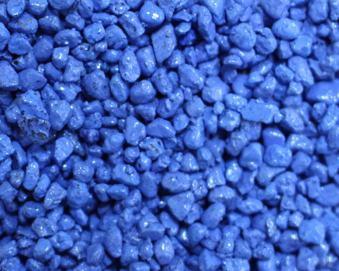 A blue pigmented quartz sand with a size of 0.7mm to 1.2mm. The quartz is bound in clear polyurethane or an epoxy resin. Other sizes are also available.